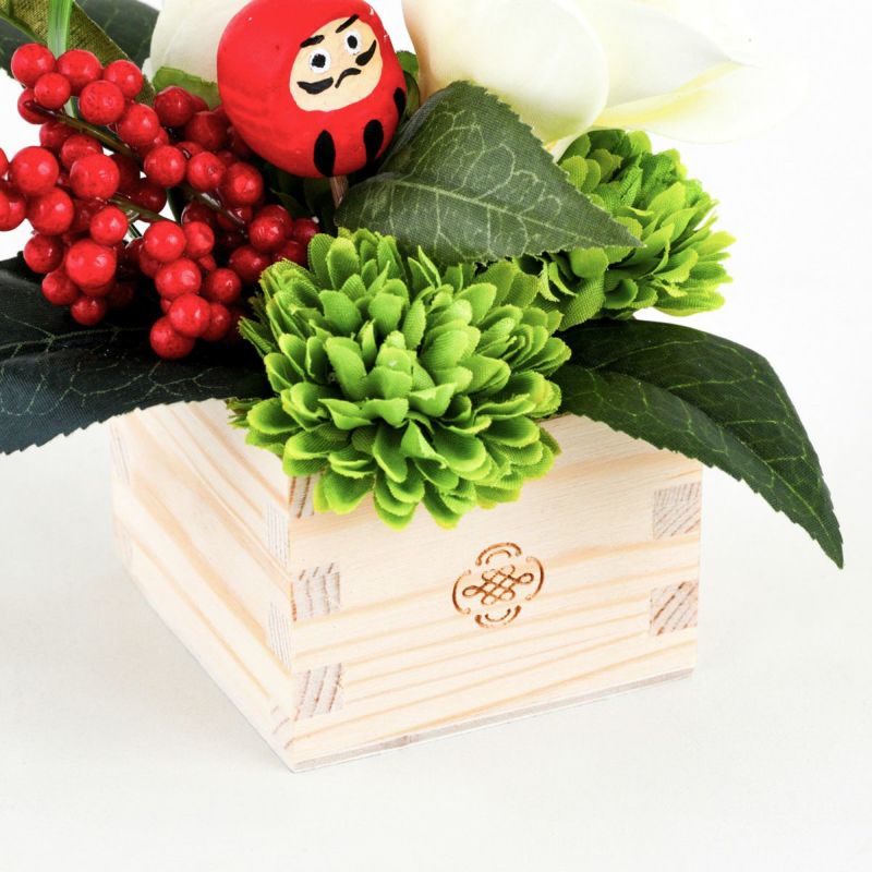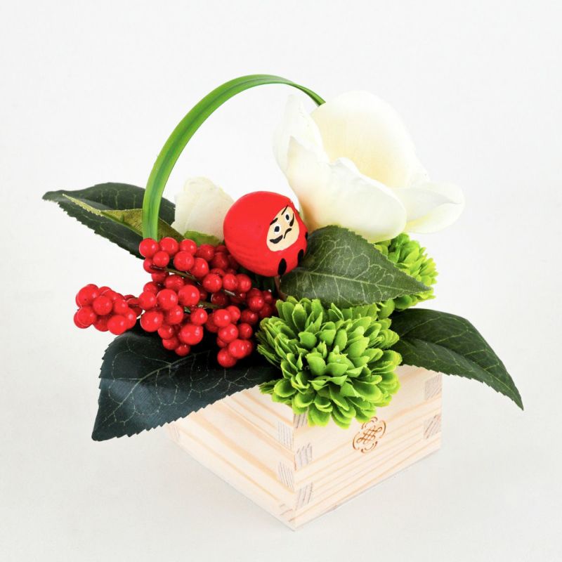 椿からひょっこり顔を出すミニだるまが可愛らしく、手のひらに乗るほど小さいアレンジですので置き場所に困りません。