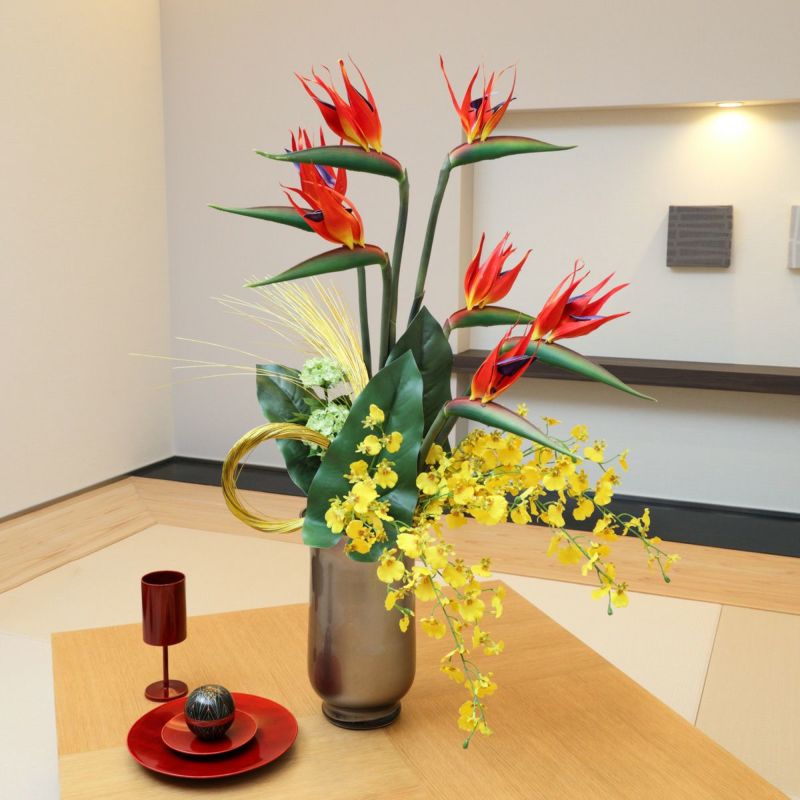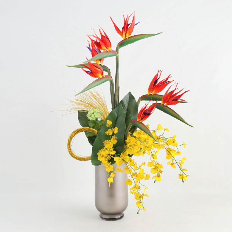華やかな花と高級感のある花器が合わさり、新年にふさわしい華やかなアレンジメントに仕上がりました。