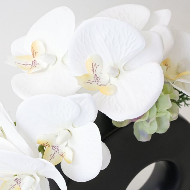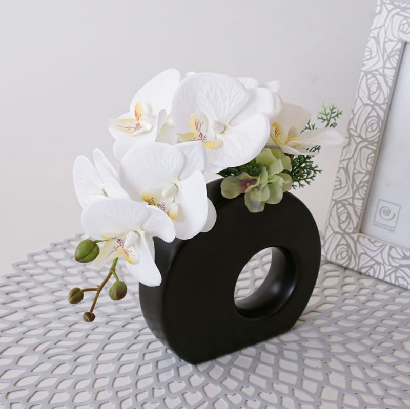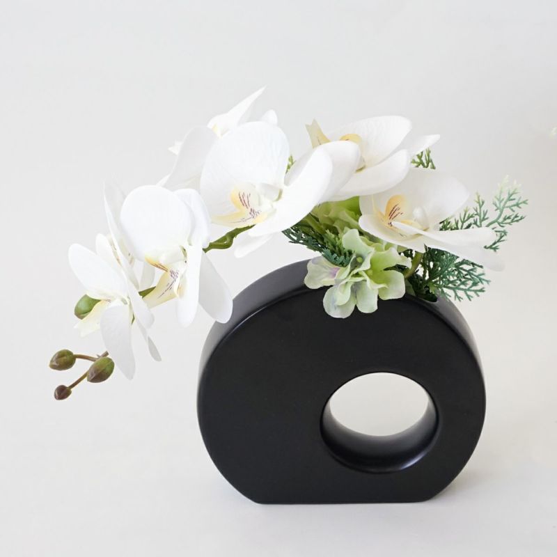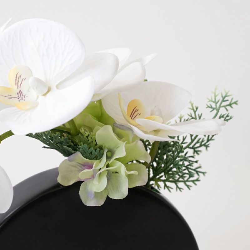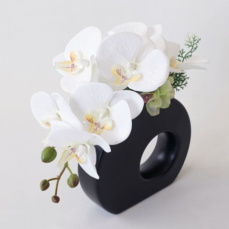 ※花器の質感がツヤからマットに変わりました。(2025/02/18)真っ白なファレノプシス(胡蝶蘭)とデザイン性の高い花器が相性抜群な、和モダンアレンジです。