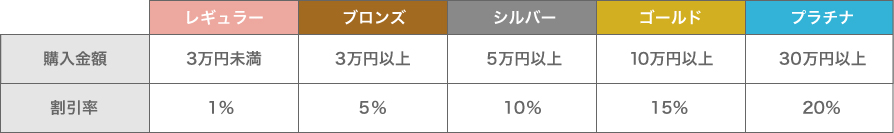 オンラインショップでの累計購入金額(税込)に応じて会員ステージが設定されます。会員ステージがアップすると、割引率がグレードアップされます。